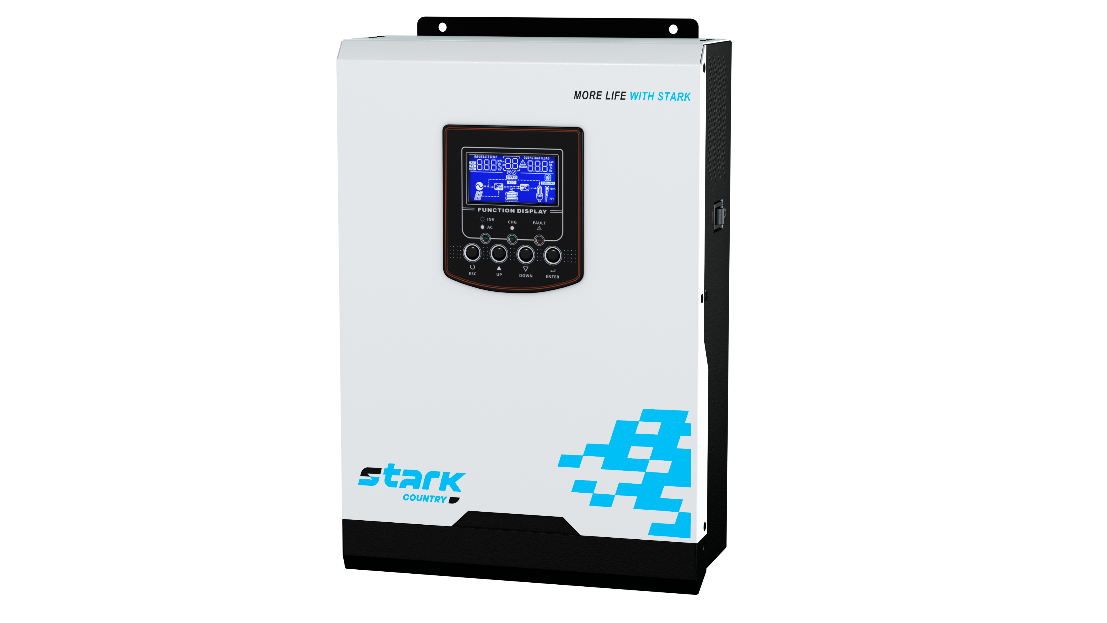 Инвертор Stark Country 2000 INV LT представляет собой многофункциональный инвертор/зарядное устройство, в котором сочетаются функции инвертора, солнечного зарядного устройства и зарядного устройства аккумуляторной батареи с тем, чтобы обеспечивать бесперебойную подачу питания на нагрузки. Компактное устройство имеет удобный универсальный дисплей и панель управления, обеспечивающую пользователю удобное конфигурирование системы при помощи кнопок. В зависимости от применения могут задаваться параметры зарядного тока аккумуляторной батареи, приоритет включения сети питания переменного тока или питания от солнечных батарей, а также допустимые параметры изменения входного напряжения.