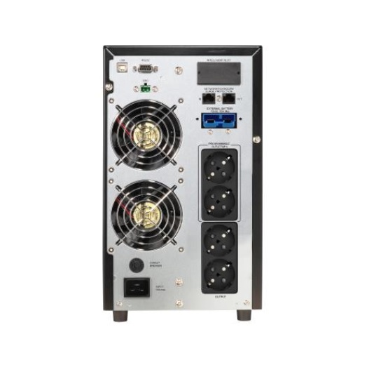 Источник бесперебойного питания Stark Country 2000 online 16А относится к группе ИБП, работающих по принципу двойного преобразования. Поступающее на вход ИБП переменное сетевое напряжение преобразуется выпрямителем в постоянное, а затем с помощью инвертора снова в переменное. Аккумуляторные батареи, подключенные к точке соединения выпрямителя и инвертора, питают последний в аварийном режиме. Причем АКБ в данном ИБП включены в цепь постоянно. Таким образом, схема Online обеспечивает идеальное выходное напряжение при любых неполадках в электросети. Она характеризуется нулевым временем переключения из нормального режима в автономный и обратно без переходных процессов в выходном напряжении.