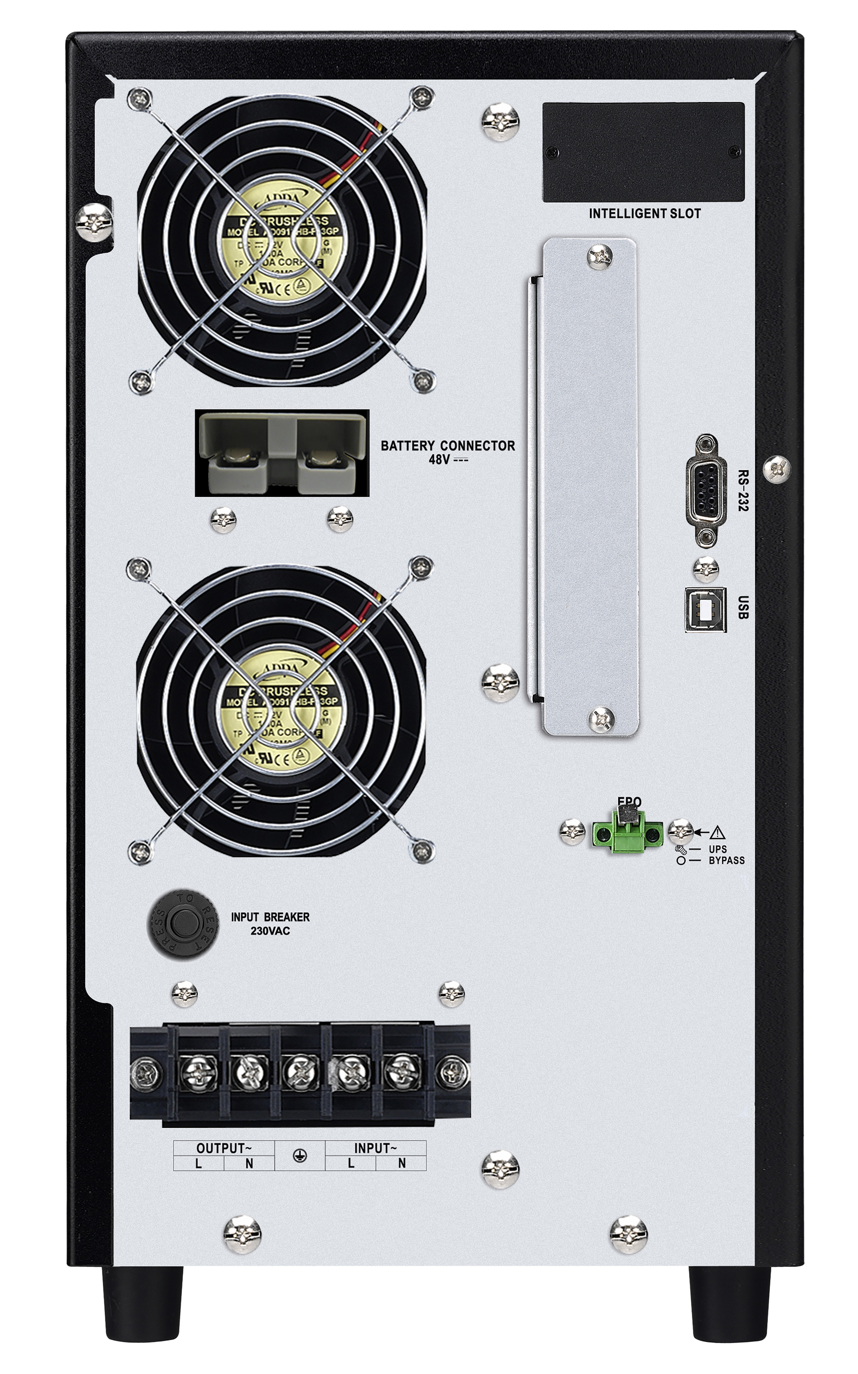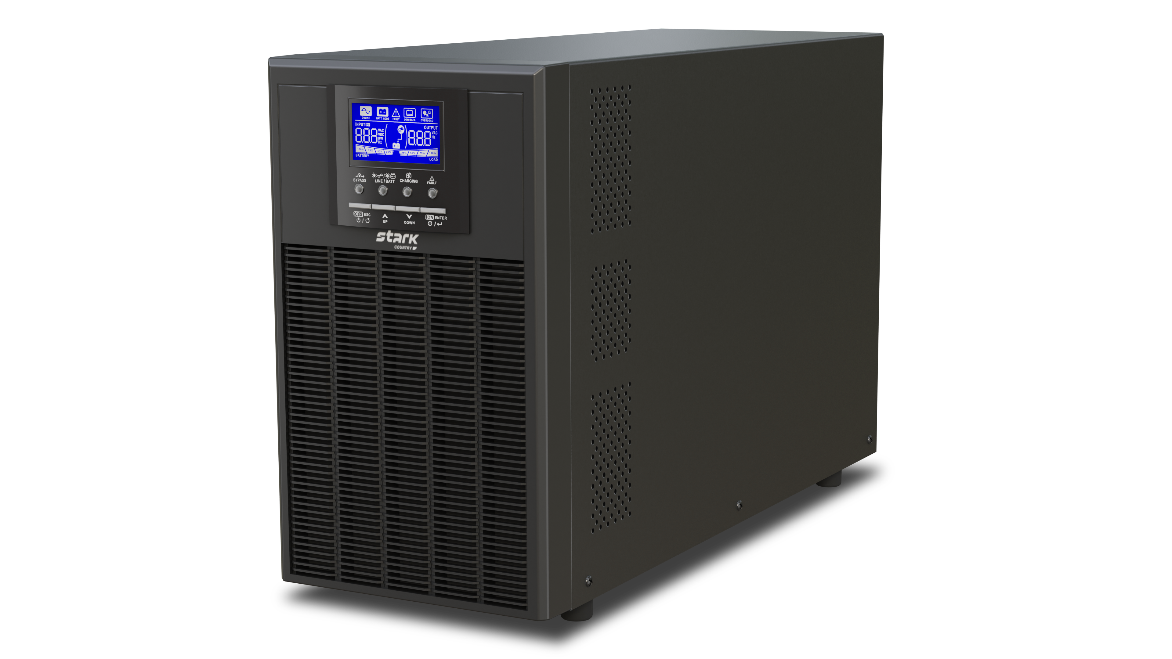 Источник бесперебойного питания Stark Country 5000 online 60А относится к группе ИБП, работающих по принципу двойного преобразования. Поступающее на вход ИБП переменное сетевое напряжение преобразуется выпрямителем в постоянное, а затем с помощью инвертора снова в переменное. Аккумуляторные батареи, подключенные к точке соединения выпрямителя и инвертора, питают последний в аварийном режиме. Причем АКБ в данном ИБП включены в цепь постоянно. Таким образом, схема Online обеспечивает идеальное выходное напряжение при любых неполадках в электросети. Она характеризуется нулевым временем переключения из нормального режима в автономный и обратно без переходных процессов в выходном напряжении.