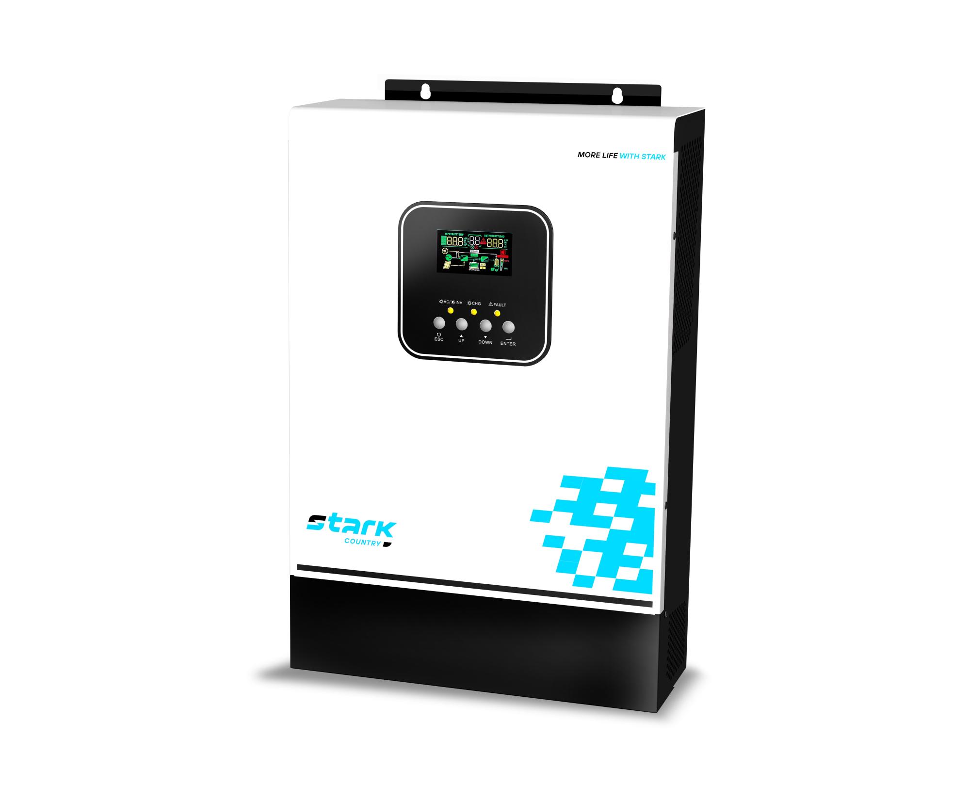 Однофазный ИБП STARK COUNTRY 6200 INV MAX производится мощностью 6200 ВА / 6200 Вт в настенном форм-факторе. Его главная особенность — работа в паре с солнечными панелями (внутри источника установлены встроенные контроллеры). Это позволяет использовать источник для питания мобильных домов, яхт и позволяет не зависеть от перебоев сети. Однофазный оффлайн источник бесперебойного питания STARK COUNTRY 6200 INV MAX совместим с любыми видами генераторов. Он обеспечивает потребителей качественным током — напряжение на выходе с батарей имеет форму чистой синусоиды. Помимо этого, ИБП имеет широчайший диапазон настроек, что позволяет адаптировать его под любые запросы. Максимальный ток зарядного устройства - 100 А. Максимальная емкость заряжаемых аккумуляторов 2400 Ач. Количество последовательно соединенных аккумуляторов - 4 шт.