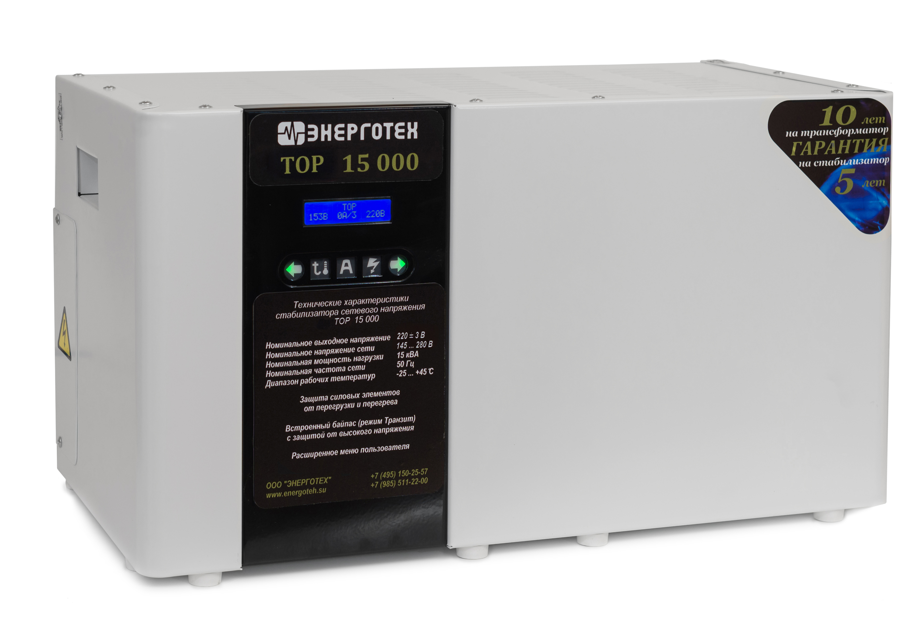 Однофазный стабилизатор напряжения Энерготех TOP 15000 предназначен для непрерывного использования в общественных местах, в жилых, коммерческих и производственных зонах. Его основным узлом является 36-ступенчатый автотрансформатор с тиристорным переключением.