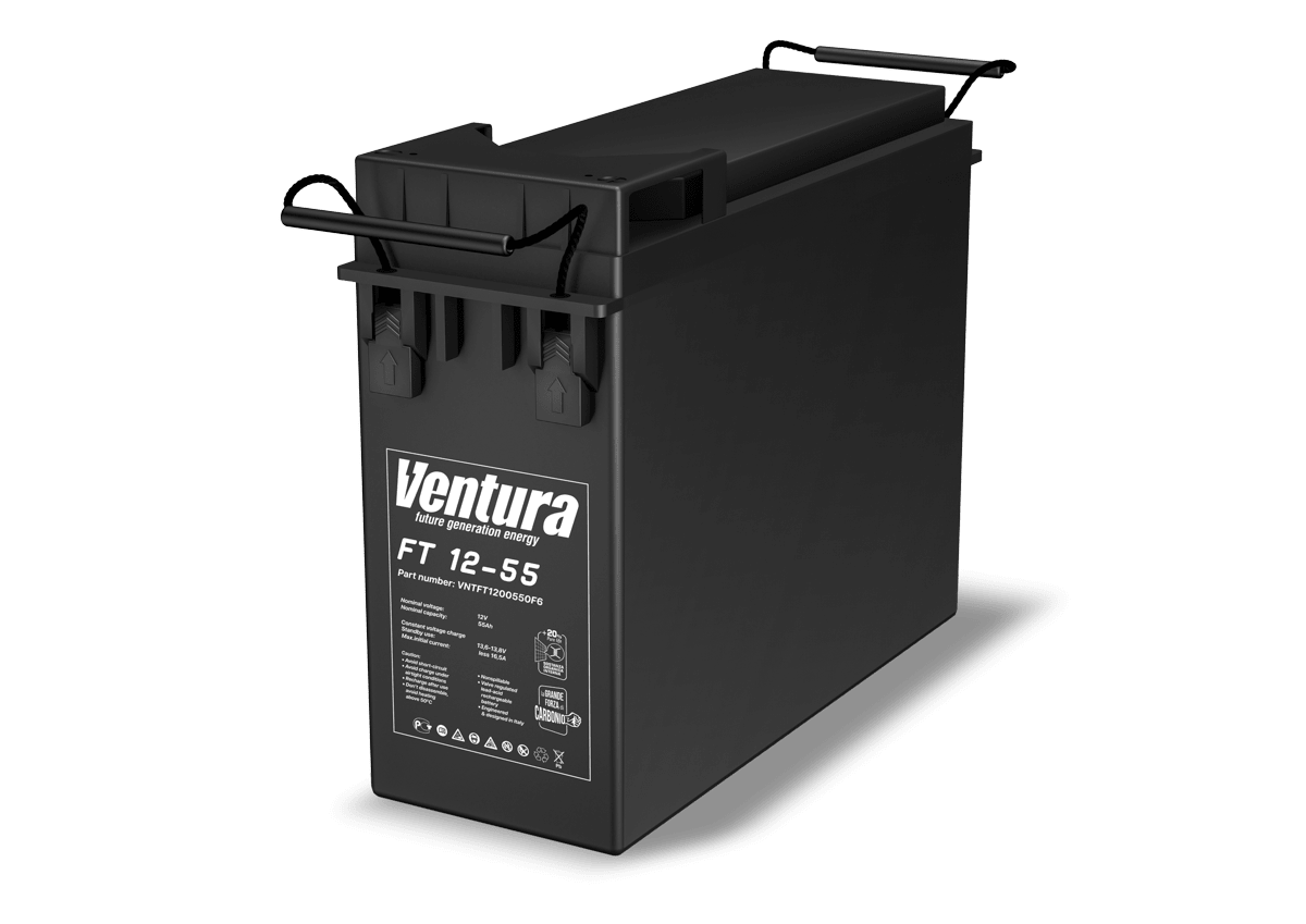 Герметизированные свинцово-кислотные аккумуляторы Ventura FT 12-55 изготавливаются по технологии AGM (технология AGM – аккумуляторы с жидким электролитом, впитанным в стекловолоконный сепаратор). Аккумуляторы Ventura FT идеальны для применения в коммерческих и бытовых источниках бесперебойного питания небольшой и средней мощности, оборудовании охранно-пожарной сигнализации, системах видеонаблюдения, устройствах автономного питания загородных домов, детских электромобилях, моторных лодках и др. Аккумуляторы серии FT могут работать как в циклическом режиме, так и в режиме постоянного подзаряда. Особенность серии — фронт-терминальное исполнение аккумуляторов, обеспечивающее удобство монтажа и обслуживания аккумуляторов в телекоммуникационных стойках или стандартных шкафах.