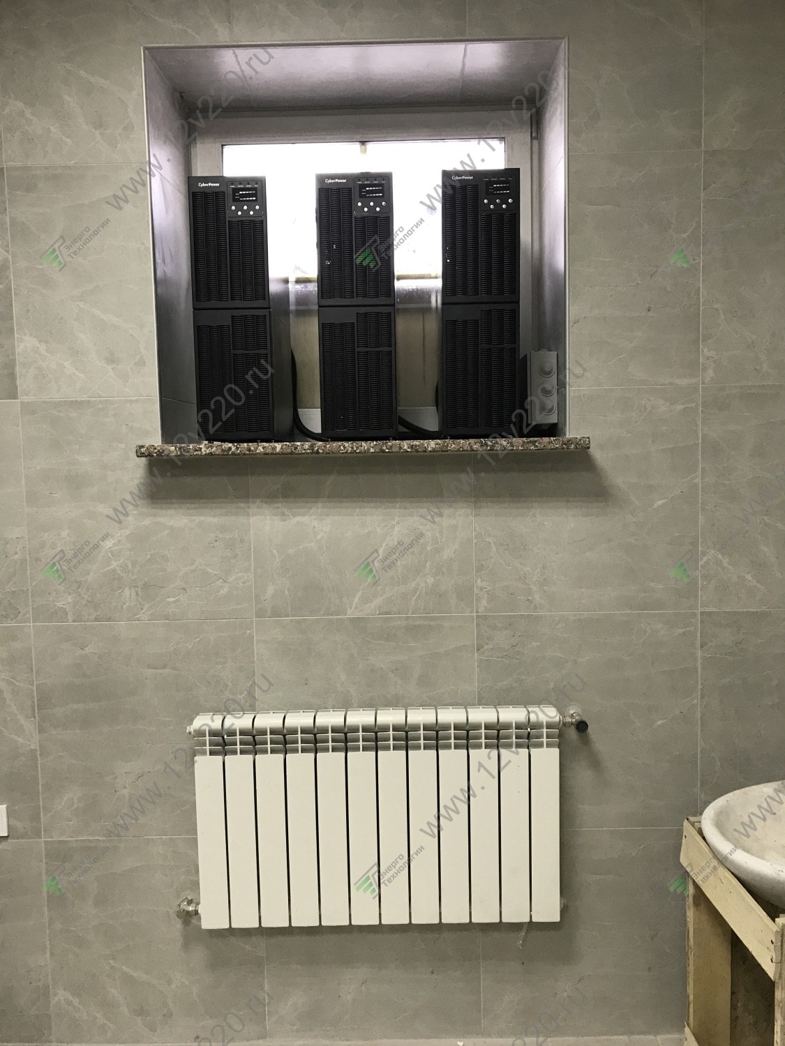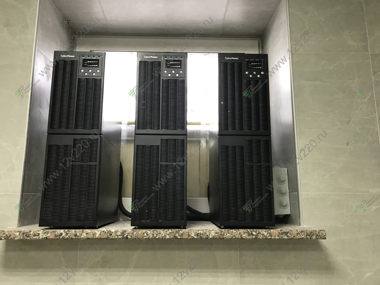 Обычно мы ставим один ИБП CyberPower OLS10000EC на основную фазу с самыми важными потребителями. В данном случае заказчик решил не мелочиться и «прикрыл» с помощью онлайн ИБП все три фазы. Получилось достаточно симпатично – ИБП нашли свой дом на подоконнике в гараже ![]()