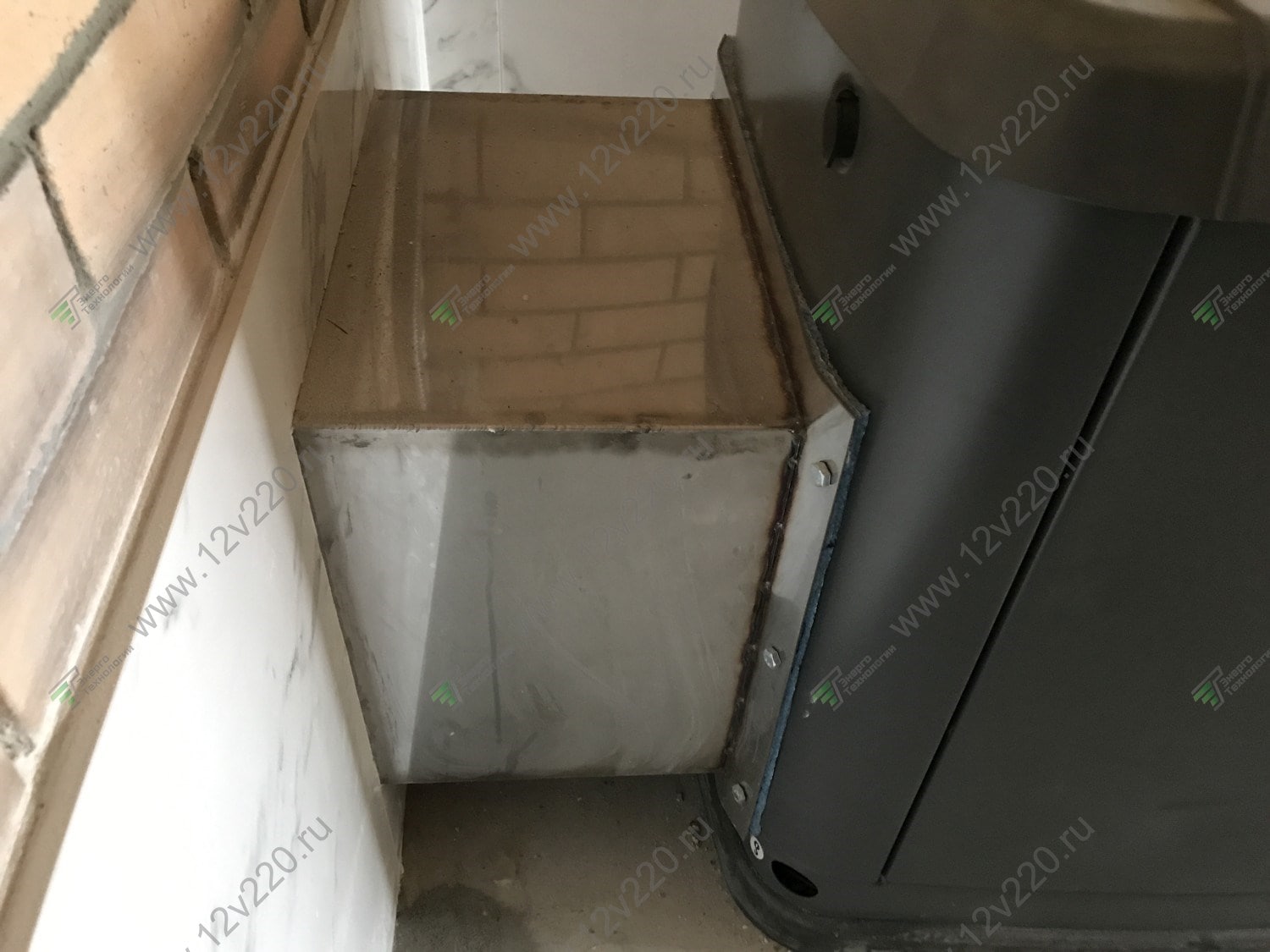 Первый Generac, который мы установили в помещении. В гараж, где находится газовый генератор, установили приточный вентилятор. А отвод газов и тепла реализовали с помощью специально сделанного на заказ короба, присоединенного к кожуху генератора.